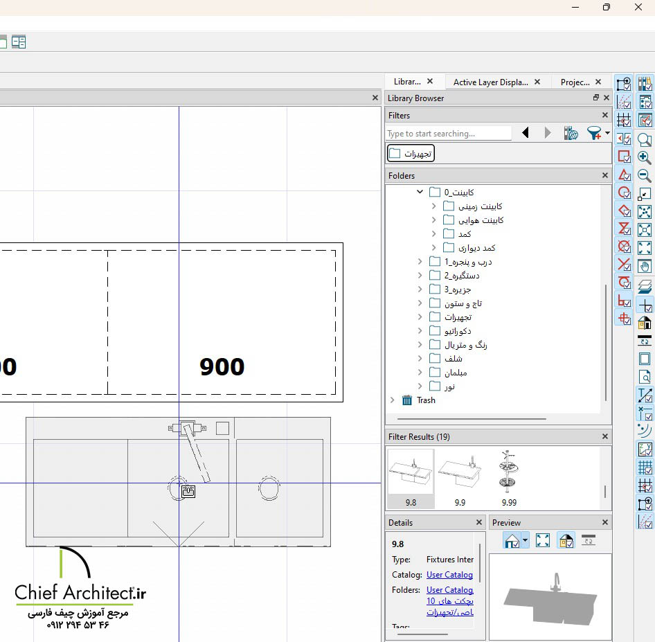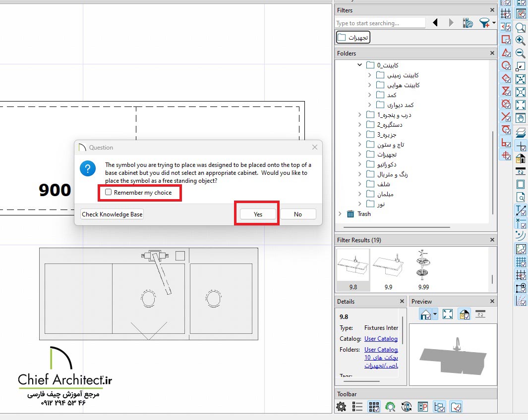 یکی از مشکلات رایج کاربران نرم افزار طراحی چیف آرشیتکت عدم قرار گیری سینک بعد از انتخاب آبجکت، در محیط خارج از یونیت کابینت زمینی می باشد. این مشکل در پی انتخاب گزینه اشتباه در هنگام قرار دادن سینک در صحنه رخ می دهد و مانند تصویر زیر سینک در محیط بیرونی یونیت قرار نمیگیر