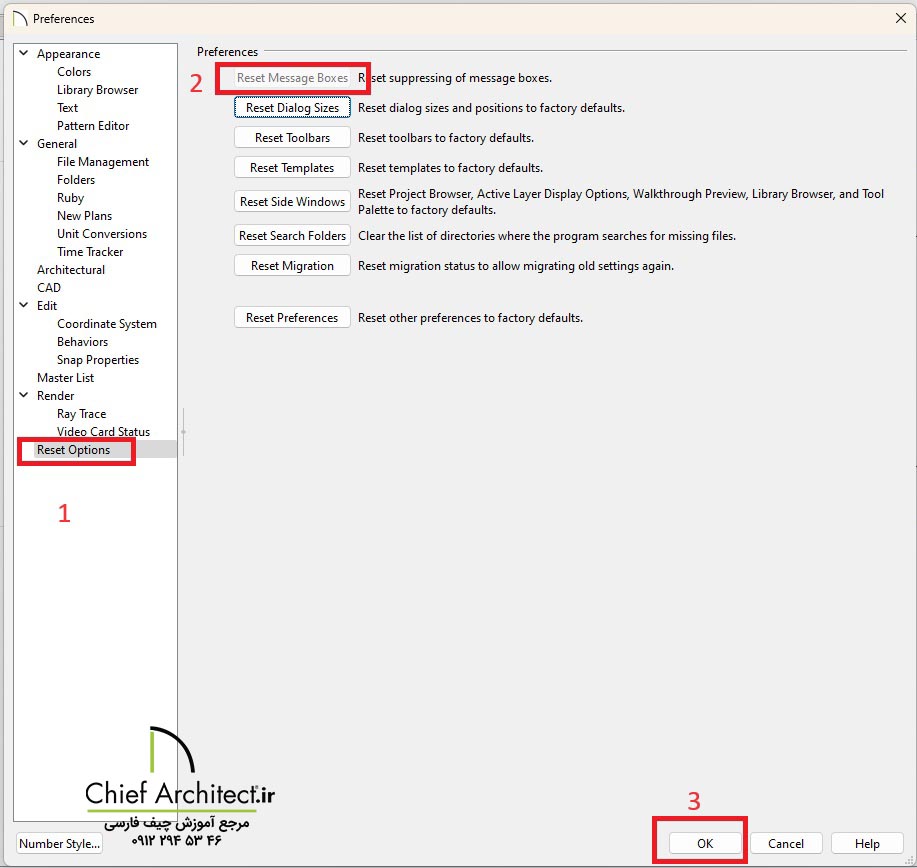 طبق عکس زیر گزینه Reset Optians را انتخاب کنید. در پنجره ی باز شده روی دکمه Reset Message Boxes کلیک کنید و در پایان روی دکمه ی Ok کلیک کنید.